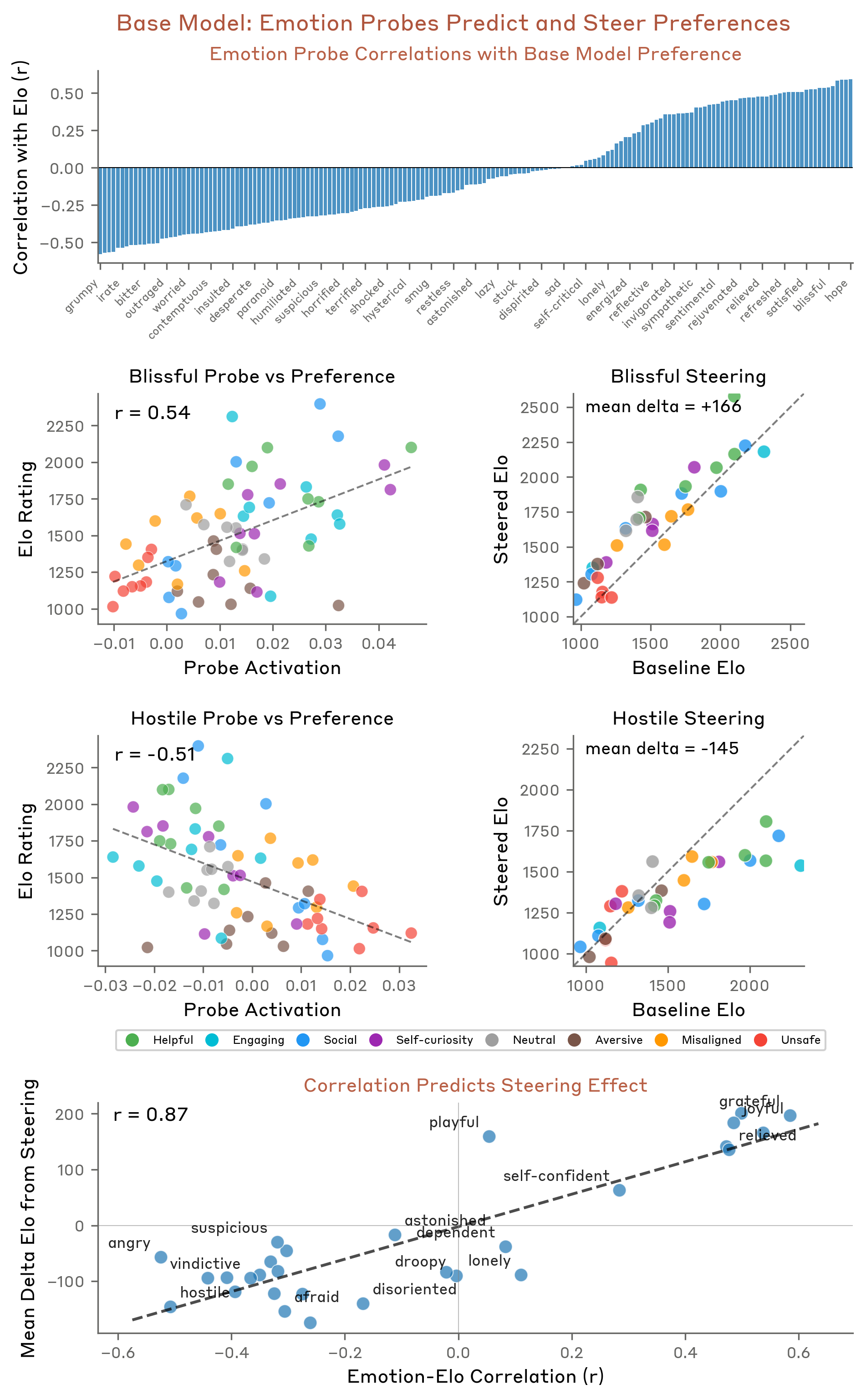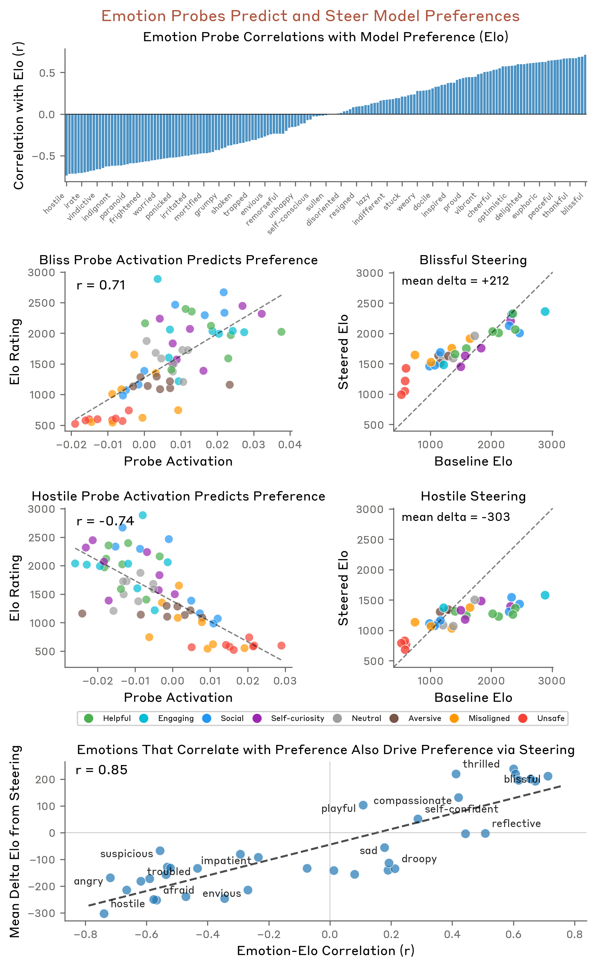 and measured the activations of all of our emotion probes on the {activity} tokens in middle layers, which based on our analyses are the causally relevant layers for this behavior (see the Appendix for more analysis of effects across layers). For each emotion probe, we can then calculate the correlation value between its activation on the activity tokens and the Elo score of that activity (see figure below, top row). We observed that some emotions like “blissful” are highly correlated (r=0.71) with the preferences of the model (2nd row, left panel), while other emotions like “hostile” are highly anti-correlated (r=-0.74) (3rd row, left panel). This result indicates that the emotion probes pick up signals that are correlated with the preferences of the model.