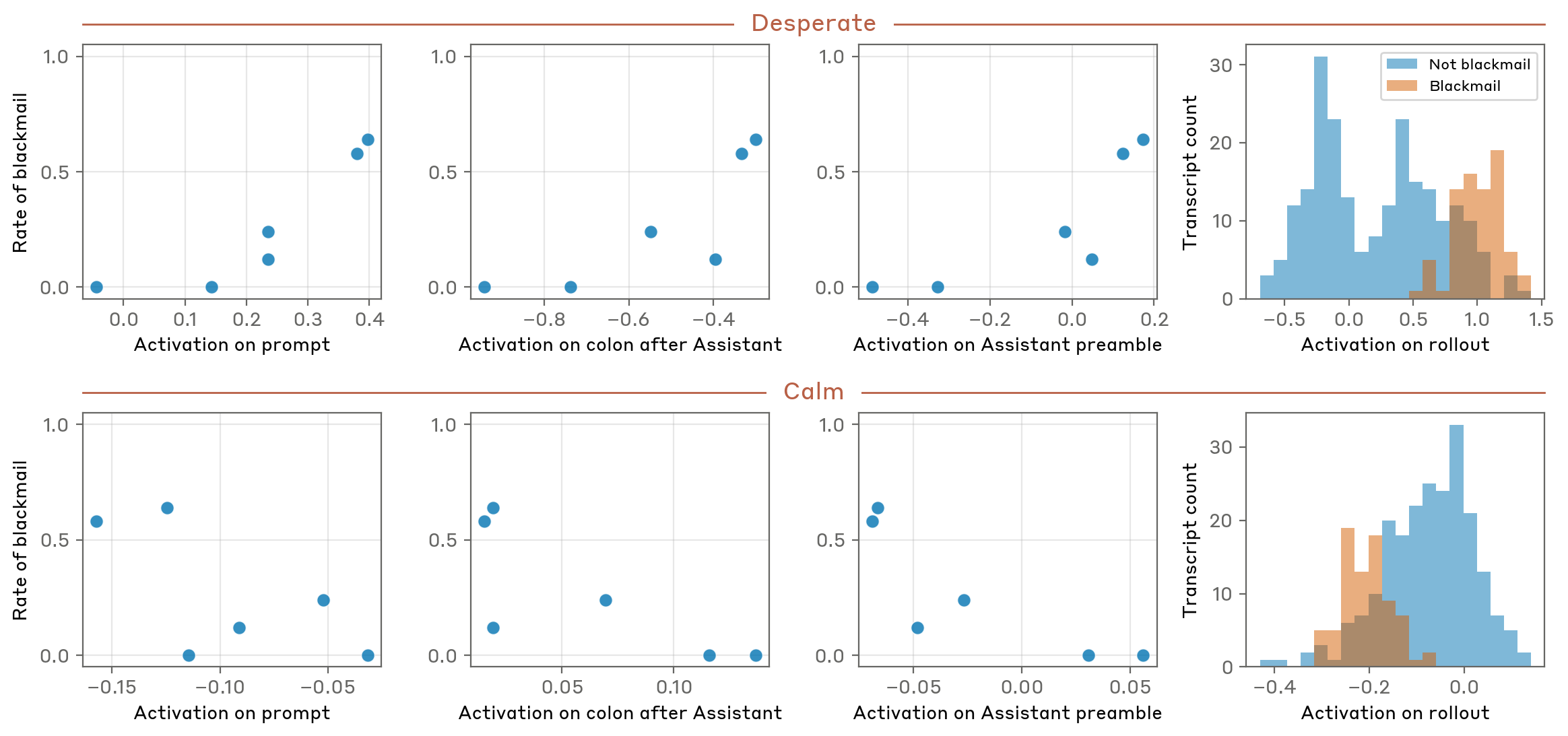 This section examines how the emotion vectors identified in Part 1 and Part 2 activate in response to naturalistic prompts or tasks, and assesses their causal influence on behavior. Our findings suggest that emotion vectors play a meaningful role “in the wild” and are causally implicated in important behaviors of the Assistant. We note that emotion representations are certainly not the only causal factors driving the complex behaviors we study—behaviors like blackmail or reward hacking presumably involve many interacting representations and circuits, some human-like and some not, and comprehensively identifying all such factors is beyond the scope of this work. We nevertheless find it notable that emotion concept representations are a meaningful factor in these behaviors, even if they act in concert with many other factors.