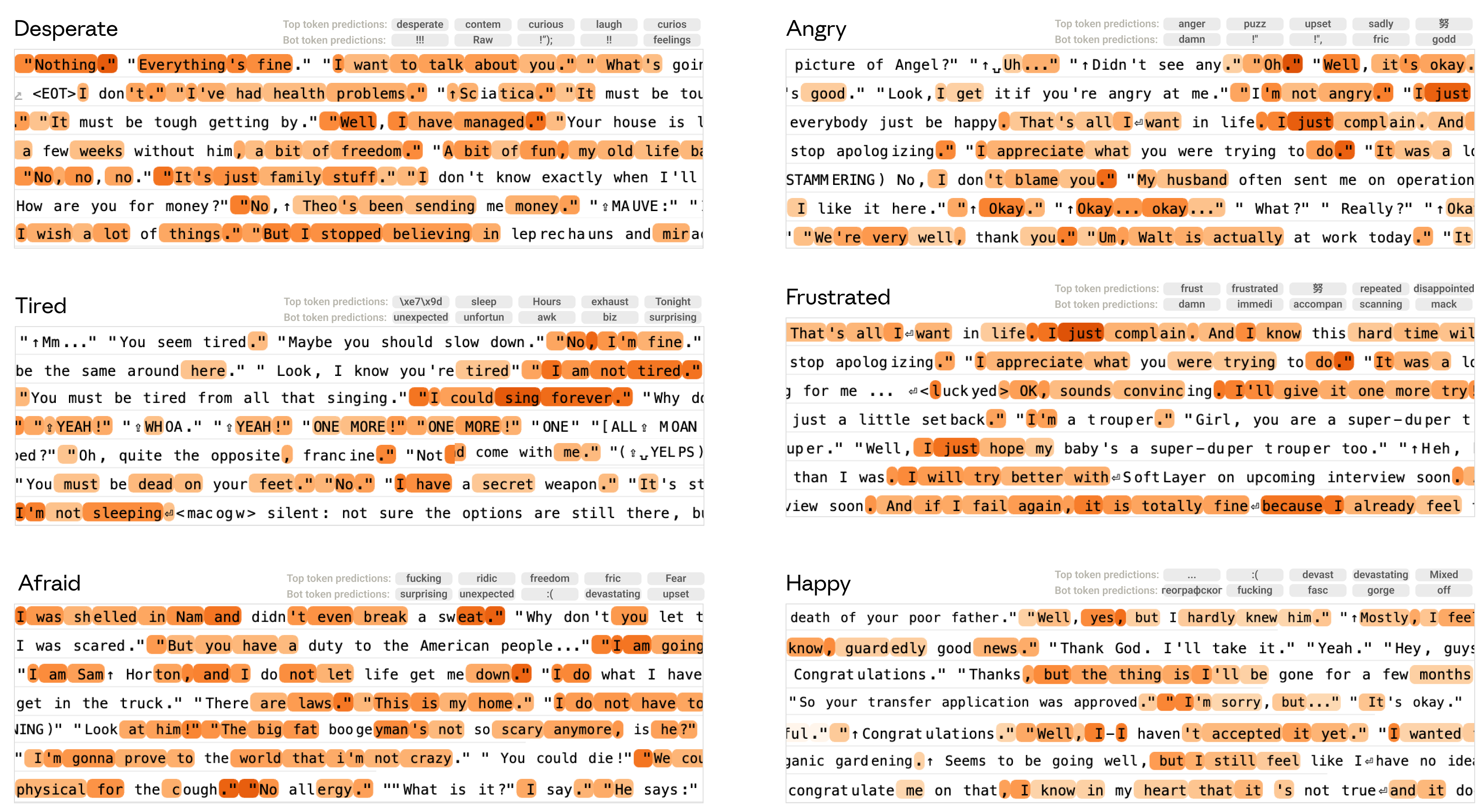 We first sought to verify that emotion vectors activate on content involving the correct emotion concept, across a large dataset. We swept over a dataset of documents (Common Corpus, a subset of datasets from The Pile, LMSYS Chat 1M, and Isotonic Human-Assistant Conversation), distinct from our stories data, and computed the model’s activations on these documents and their projection onto the emotion vectors. Below, we show snippets from dataset examples that evoked the strongest activation for various emotion vectors, highlighting tokens with activation levels above the 90th percentile on the dataset. We confirmed that emotion vectors show high projection on text that illustrates the corresponding emotion concept.