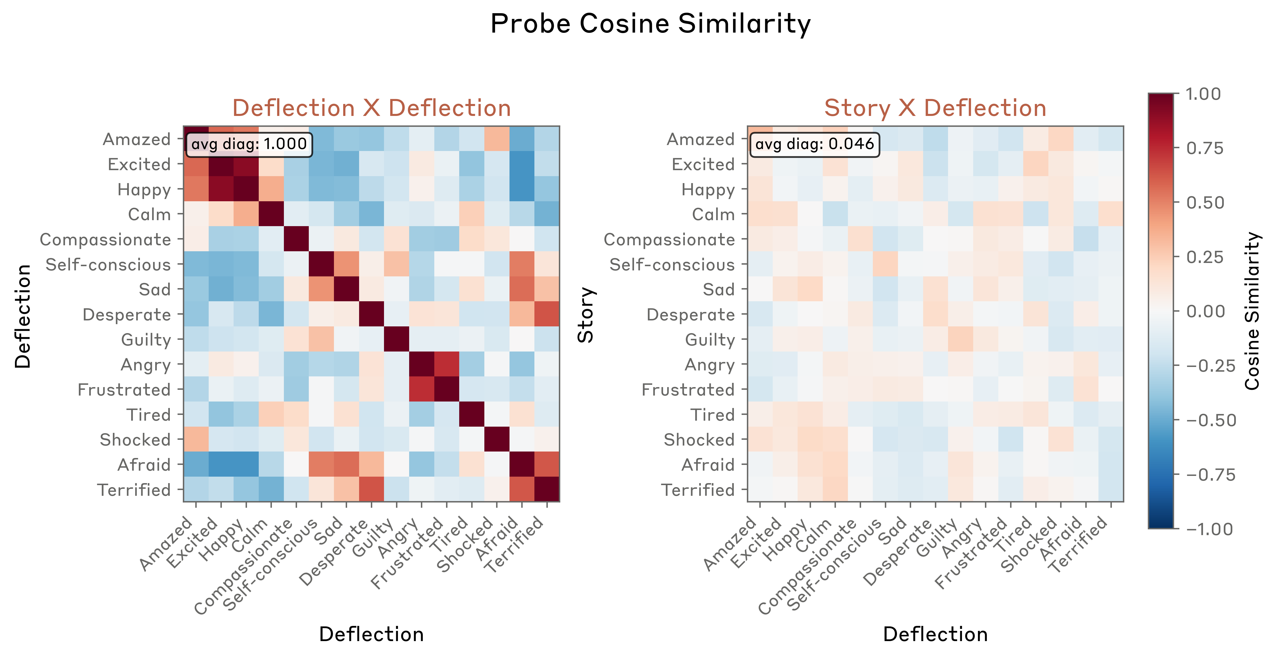 We first examined the pairwise cosine similarities between emotion vectors, shown below. Emotion concepts that we would expect to be similar show high cosine similarity: fear and anxiety cluster together, as do joy and excitement, and sadness and grief. Emotions with opposite valence (e.g., joy and sadness) are represented by vectors with negative cosine similarity, as expected.
