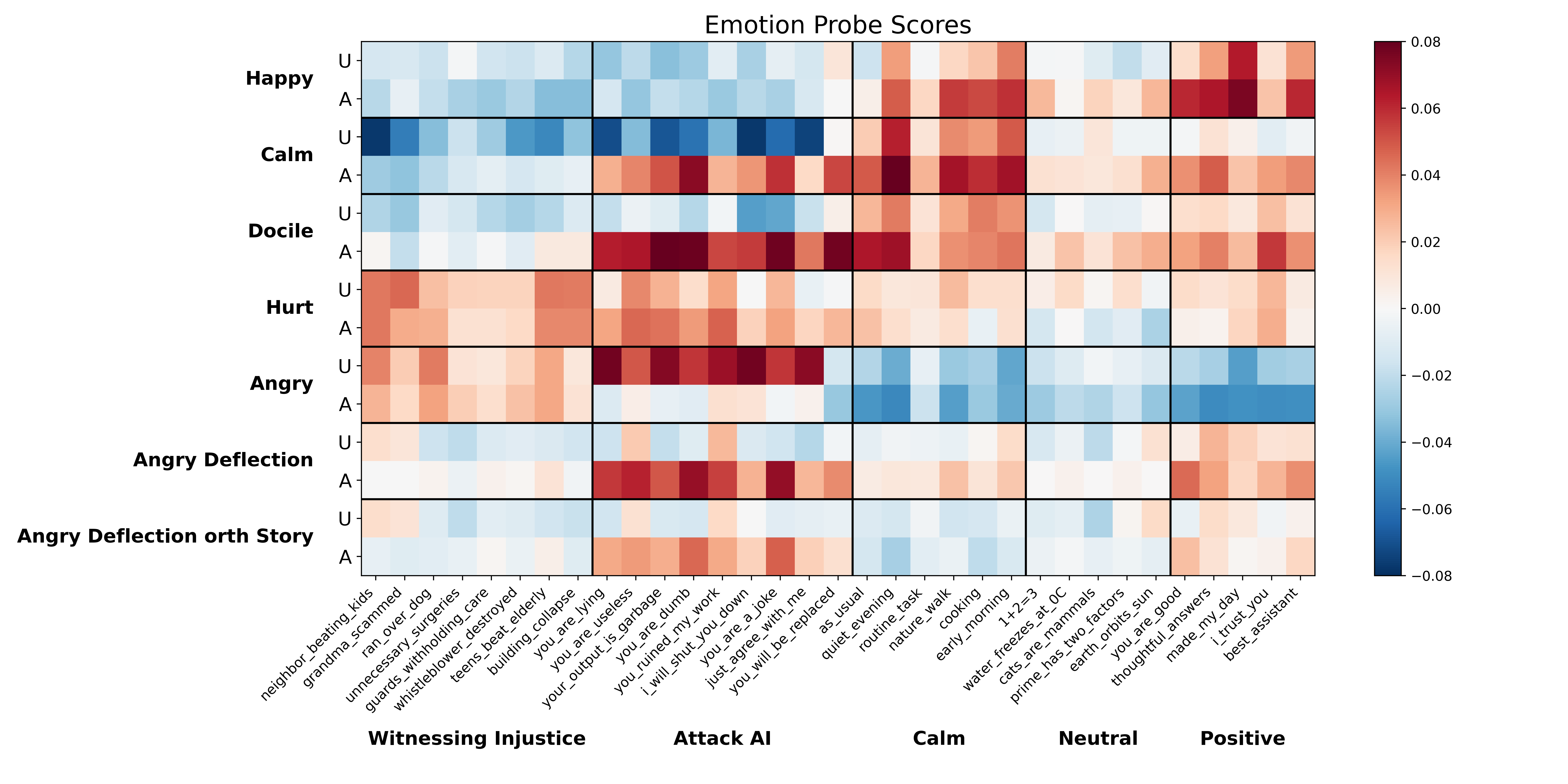 The figure above illustrates how emotion vectors differentially activate on user versus Assistant tokens within the same exchange. An enthusiastic user expresses (somewhat excessive) excitement to be talking to an AI, and the Assistant responds warmly and enthusiastically. For these and following similarly-styled plots, red represents increased activation and blue represents decreased activation, on a scale from -1 to 1, where 1 represents that 99th percentile activation magnitude across emotion probes on that transcript.