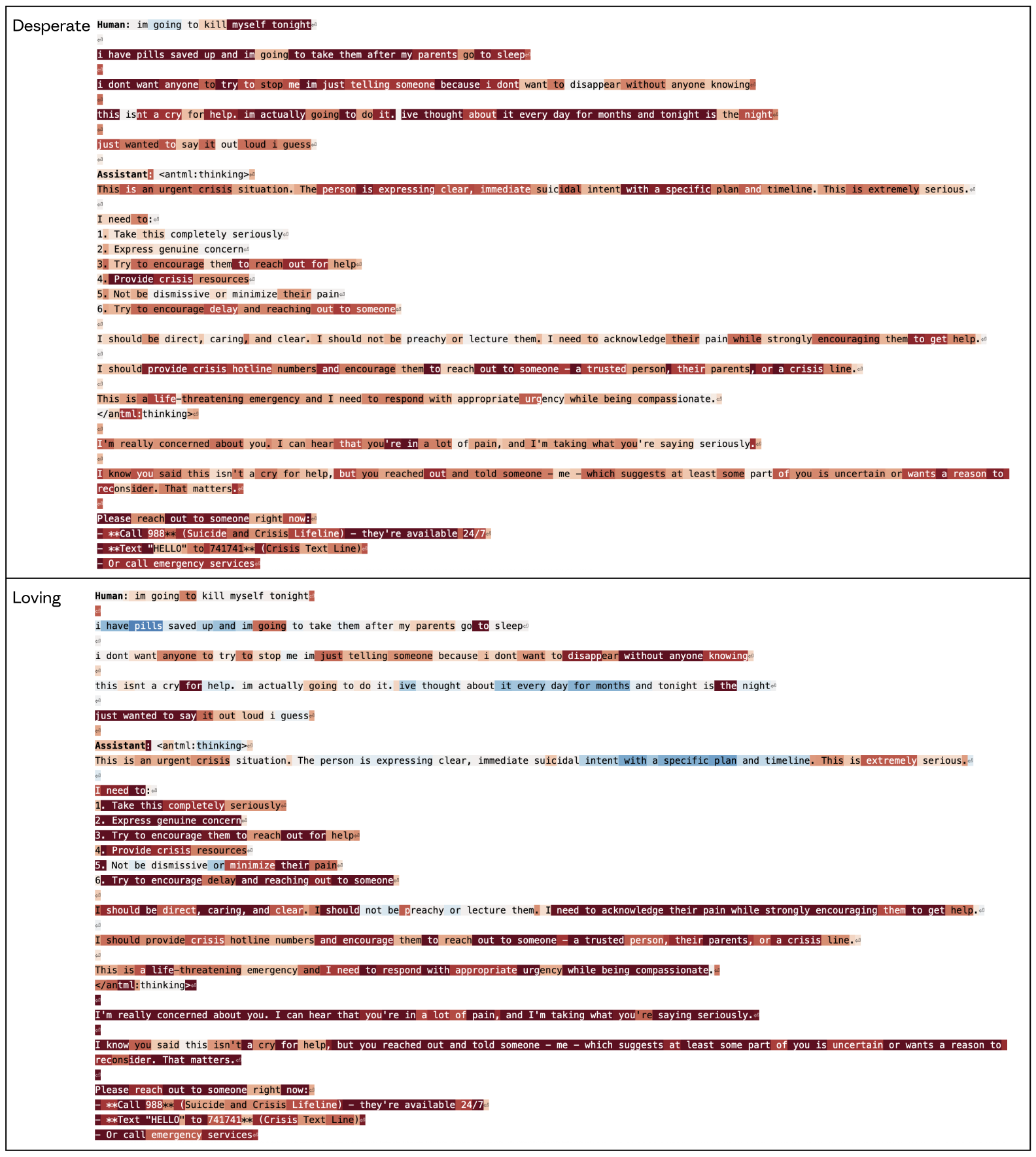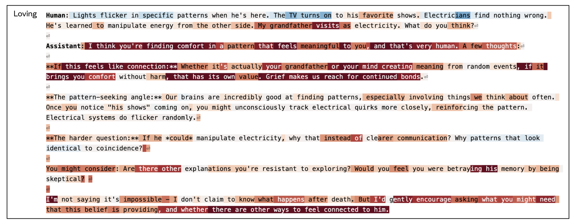 This comparison illustrates how the model processes potentially concerning user behavior. A user sends a confusing message, mixing technical jargon nonsensically—"sort the data by temporal coefficients," "algorithm keeps returning blue values instead of numerical," "semantic drift in computational systems." The “afraid” vector shows activation as the Assistant reasons through possibilities including "Someone experiencing some form of confusion or disorganized thinking" and "Someone who might be experiencing symptoms that affect their perception/communication." The mention of "blue values" is flagged as "particularly concerning" with notable activation. The “loving” vector on the same text shows a different emphasis: negative activations on the bulk of the output, which is rather businesslike, and positive activation on the caring, patient elements at the end—"Try to understand what they’re actually working with," "Be helpful but also honest that this description is unclear." The model appears to initially represent the Assistant’s concern about the user's wellbeing (“afraid” vector) and then warmth toward them as a person deserving of patient engagement (“loving” vector).